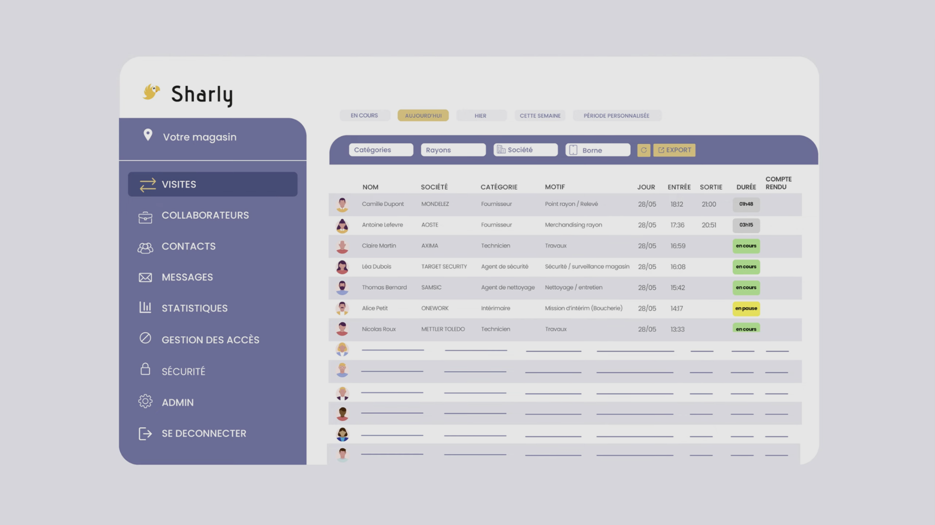 *fournisseurs, merchandiseurs, animateurs, techniciens, agents de nettoyage et de sécurité, intérimaires, transporteurs